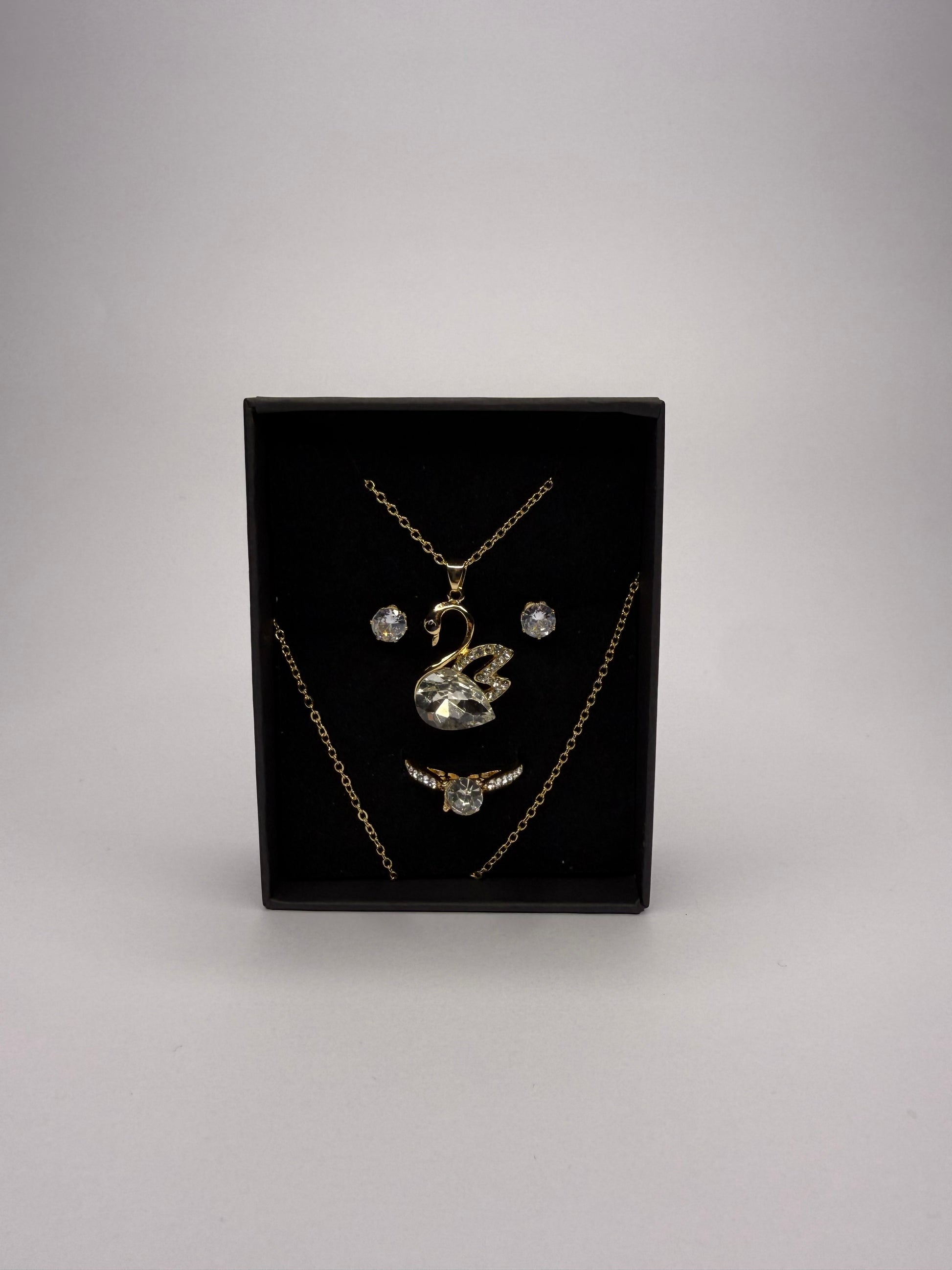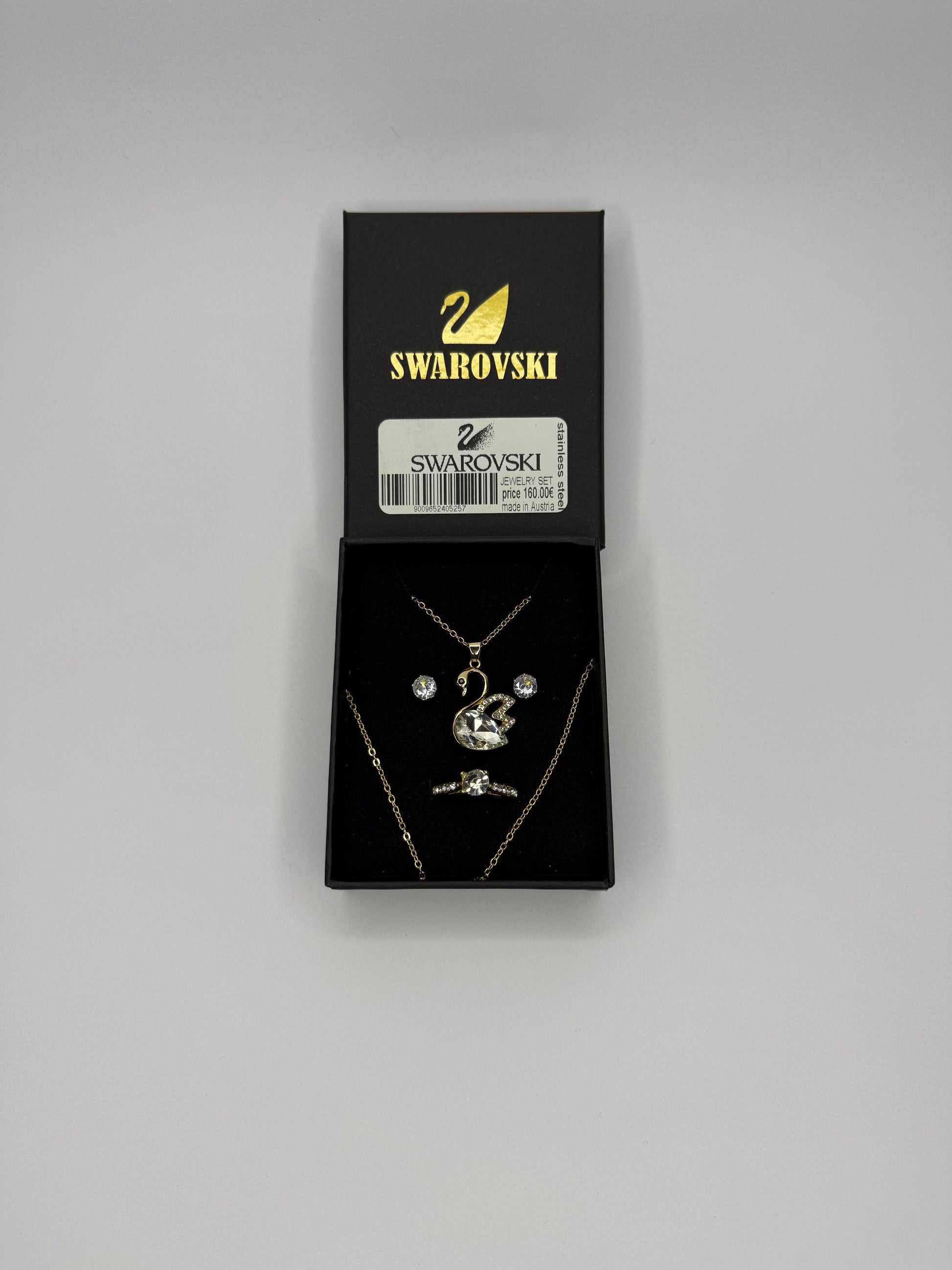 Αναδείξτε τη λάμψη σας με αυτό το εκλεπτυσμένο σετ κοσμημάτων Swarovski. Περιλαμβάνει κολιέ με μοτίφ κύκνου, σκουλαρίκια και δαχτυλίδι, διακοσμημένα με αυθεντικά κρύσταλλα Swarovski που αντανακλούν το φως με μοναδικό τρόπο.