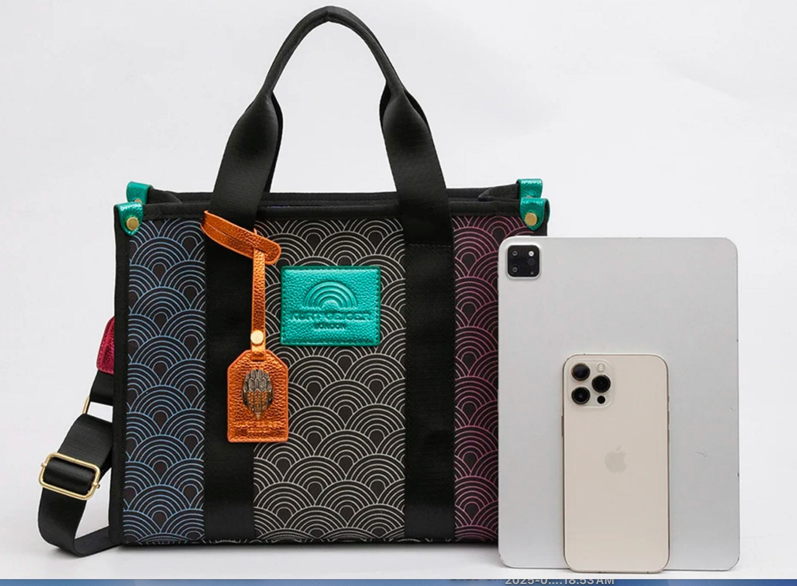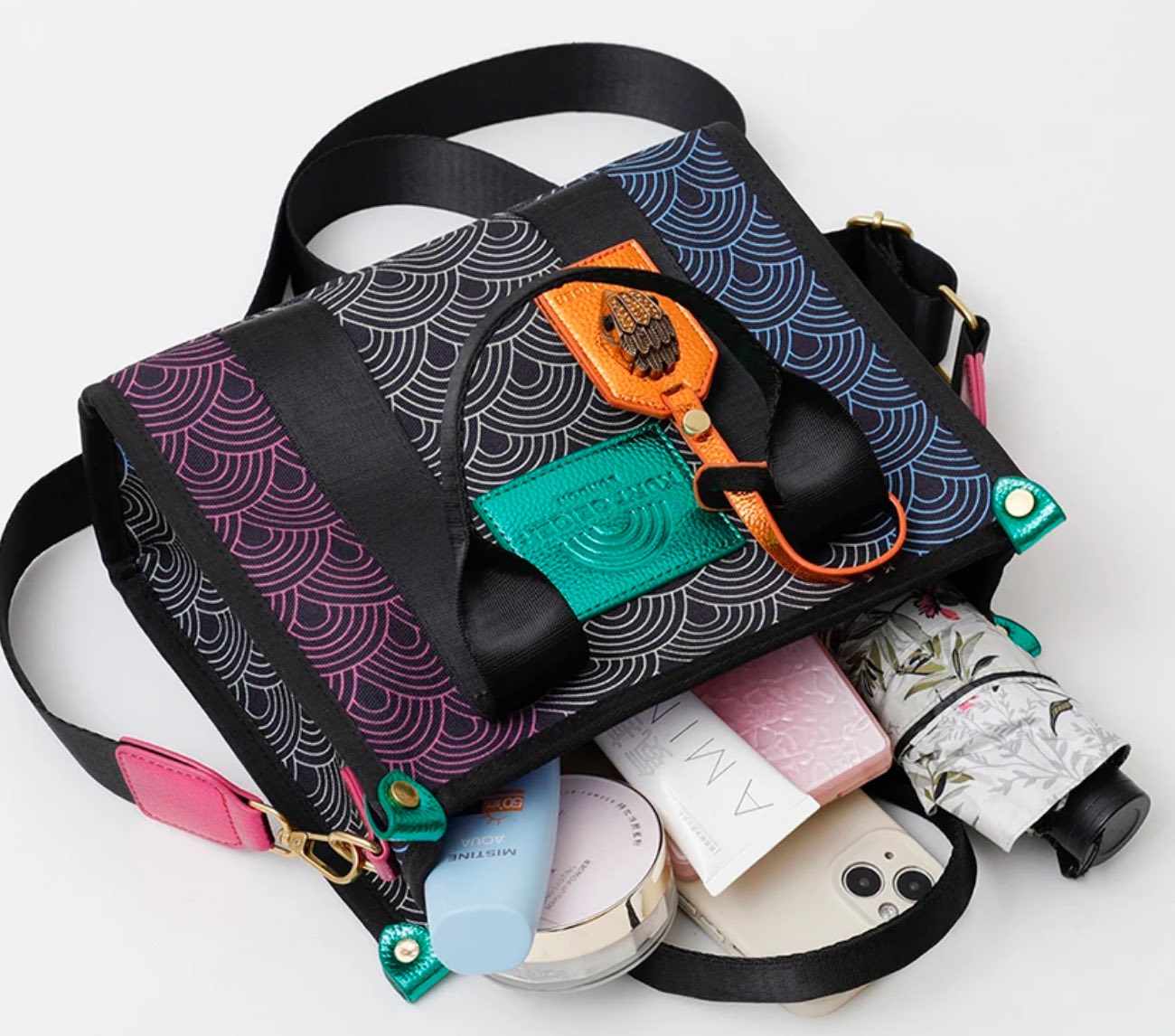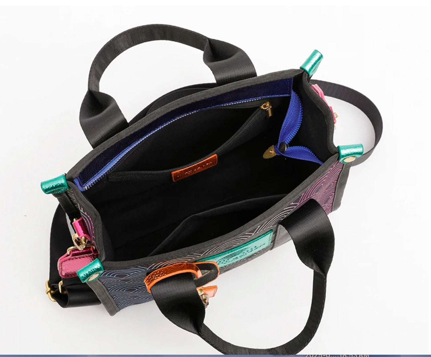 Κατασκευασμένη από ανθεκτικό ύφασμα με μοντέρνο κυματιστό μοτίβο σε αποχρώσεις του μπλε, μωβ και ροζ, διαθέτει φαρδιές μαύρες λαβές και αποσπώμενο ρυθμιζόμενο λουρί για άνεση και ευελιξία.